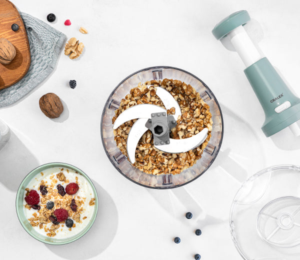 Five durable stainless steel blades chop even hard ingredients like carrots and walnuts. Cleaning is also quick and easy.